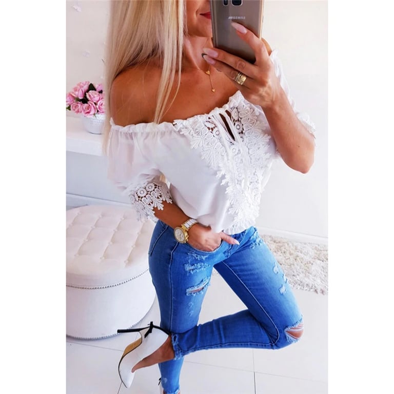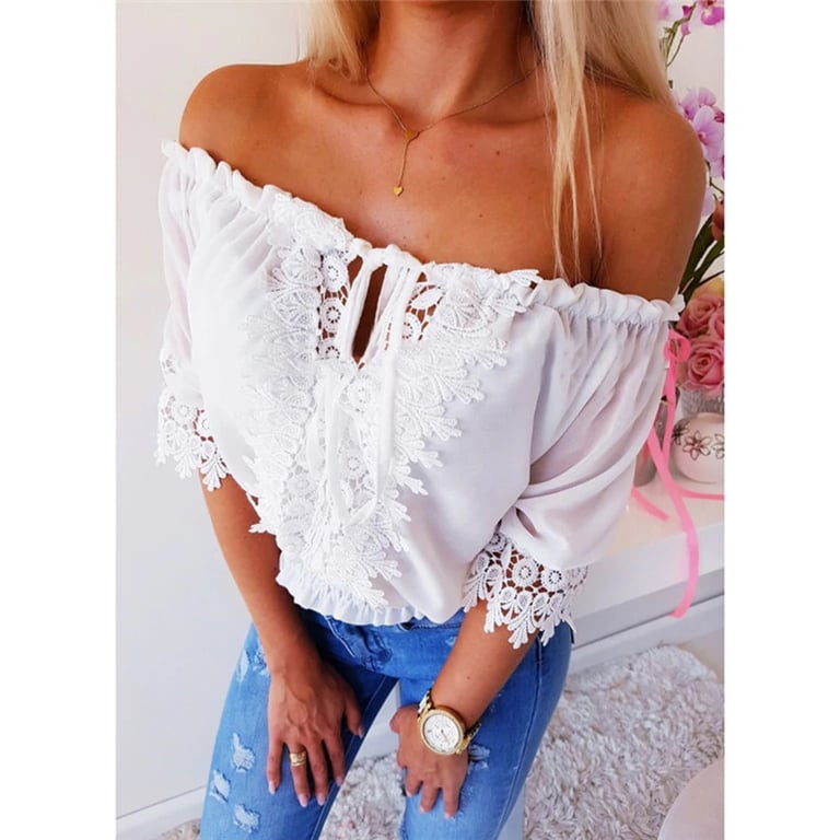 Dames witte top met blote schouders, kant en striksluiting. Heeft 3/4 mouwen.