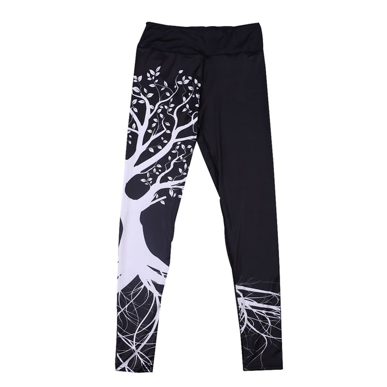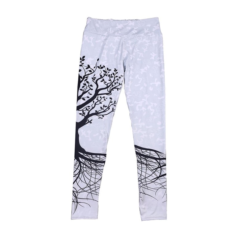 Dameslegging met hoge taille, die een boomprint over één helft van de legging heeft.