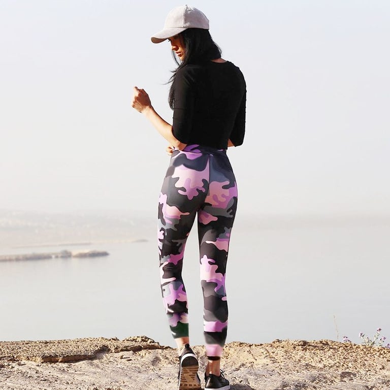 Dames fitness leggings met hoge elastische tailleband van rubber. Kleurrijke legerprint.