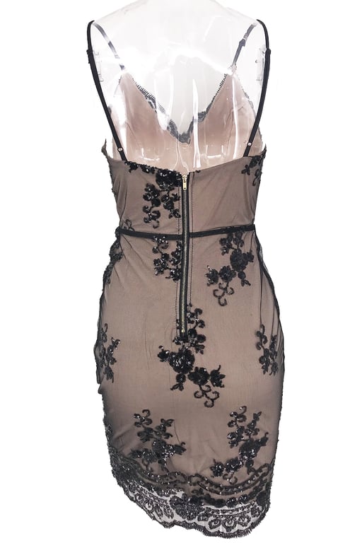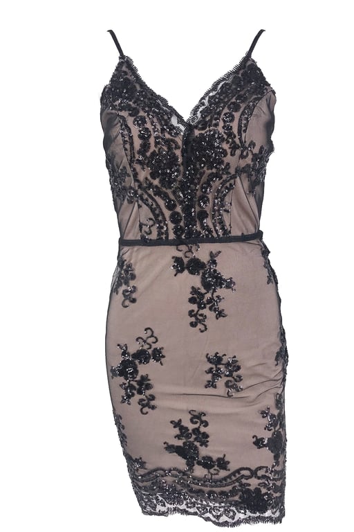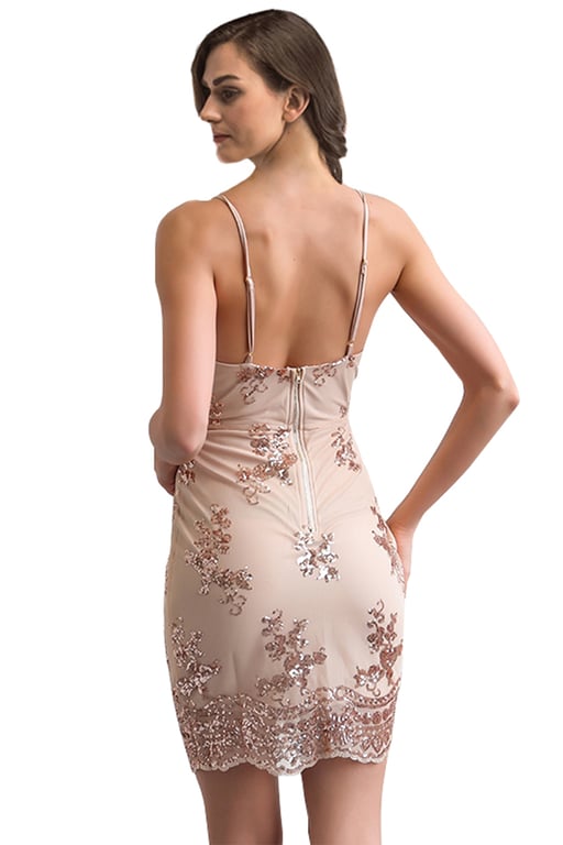 De jurk heeft een V-hals en is versierd met bloemen.