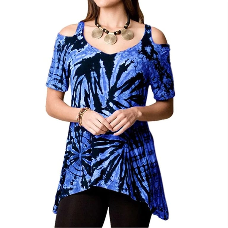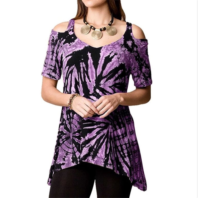 Unieke batik top met korte mouwen en blote schouders. Modieuze, bredere snit ideaal voor de zomer.