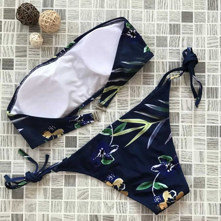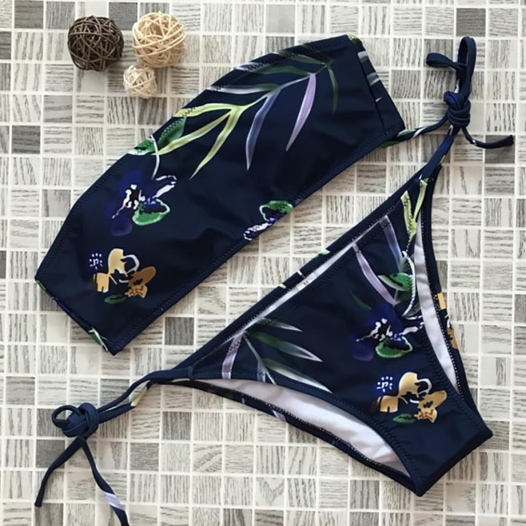 Dames tweedelige bikini met kleurrijk bloemenmotief. De onderkant met strikjes en de bovenkant zonder bandjes.
