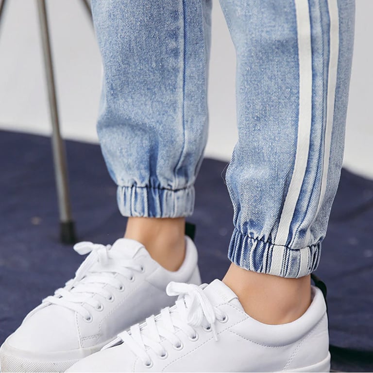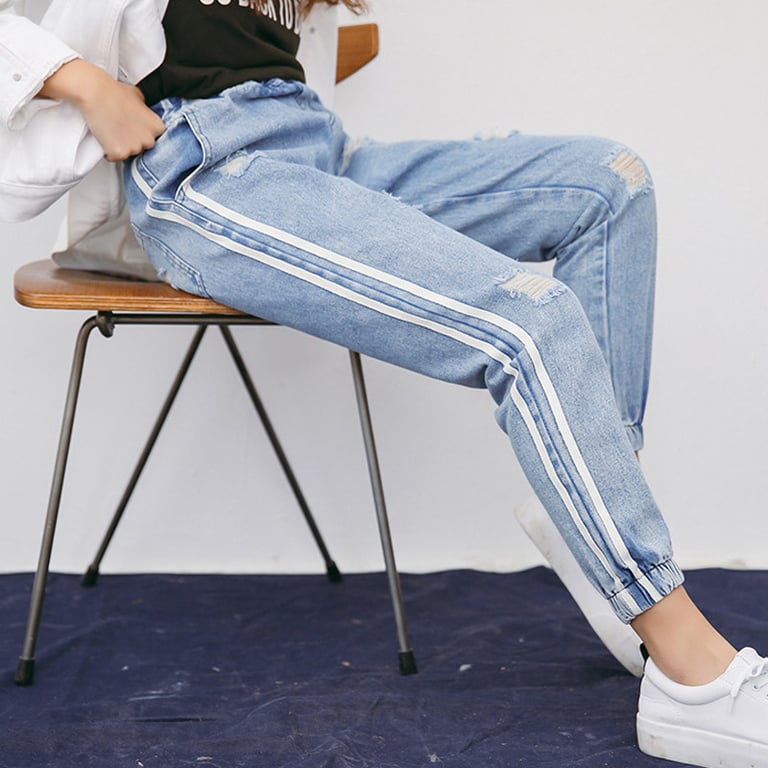 Dames boyfriend denim jeans met decoratieve scheuren. Brede pijpen met een zijstreep. Elastische tailleband van rubber.