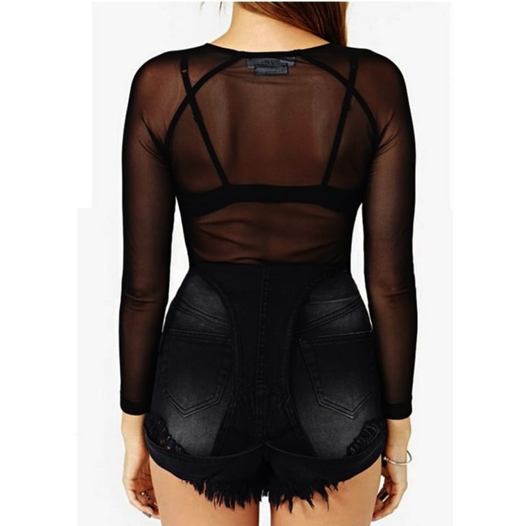 Dames zwart T-shirt met ronde hals en lange mouwen. Sexy doorzichtig materiaal.