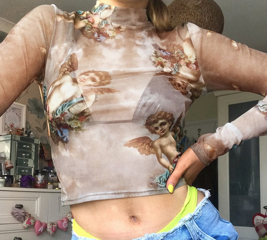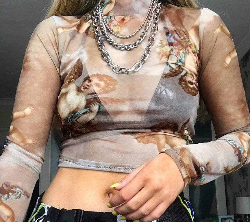 Doorzichtige top met engelmotieven. Lange mouwen, lage rolkraag.