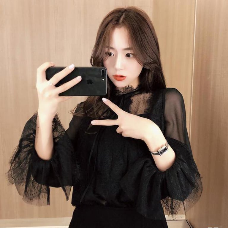 Het heeft lange doorzichtige mouwen die aan het einde wijd uitlopen.