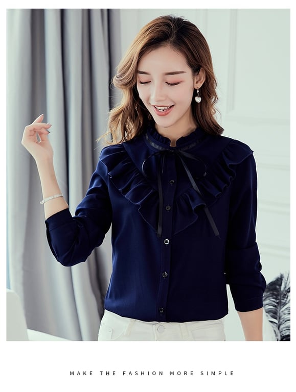 Dames elegante blouse in modieuze kleuren. Heeft 7/8 mouwen, sluit met knopen en is versierd met een strik en een volant.