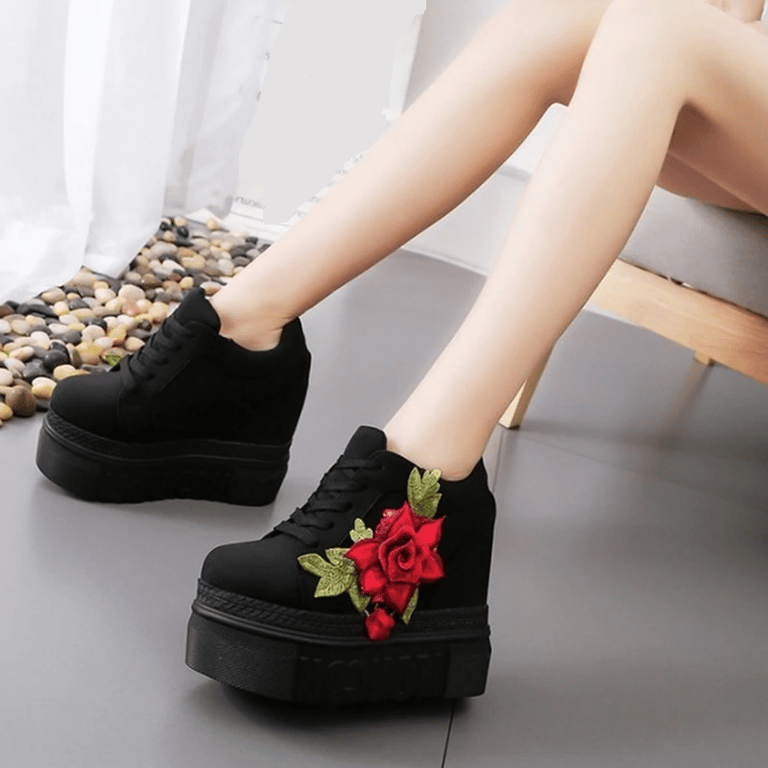 Deze platform enkelschoenen zijn versierd met een 3D bloem. De sneakers zijn comfortabel en worden vastgemaakt met veters.