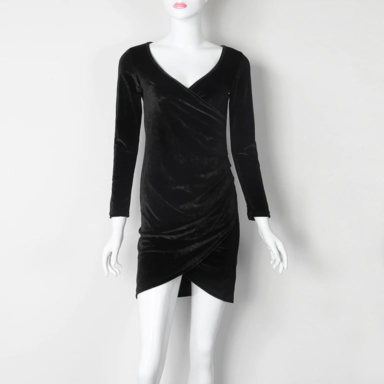 Dames korte fluwelen jurk met lange mouwen. De jurk heeft een asymmetrische snit en een diepe V-hals. Ideaal voor een feestje of evenement. Verkrijgbaar in verschillende kleuren.