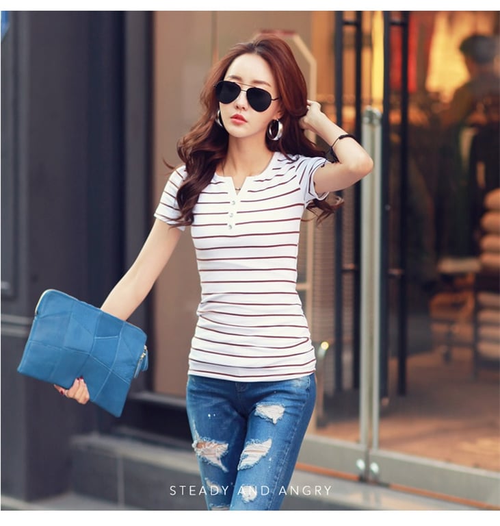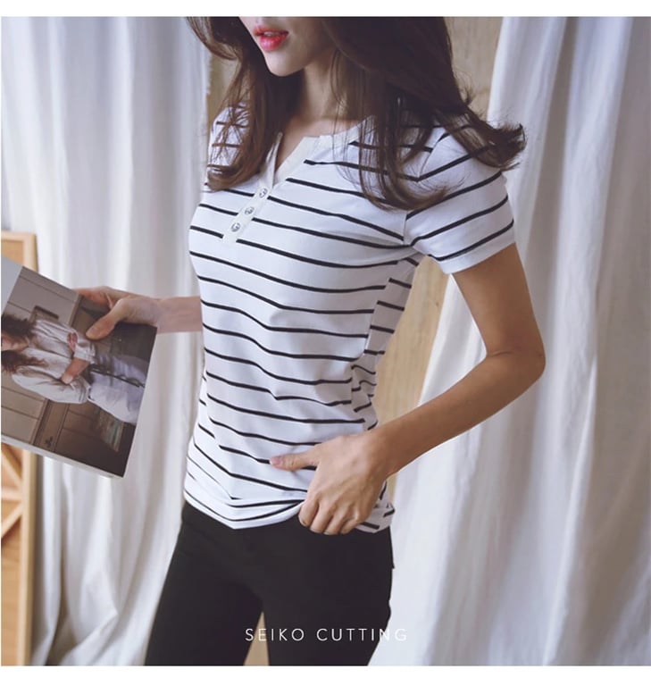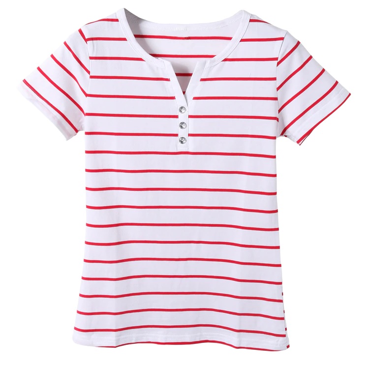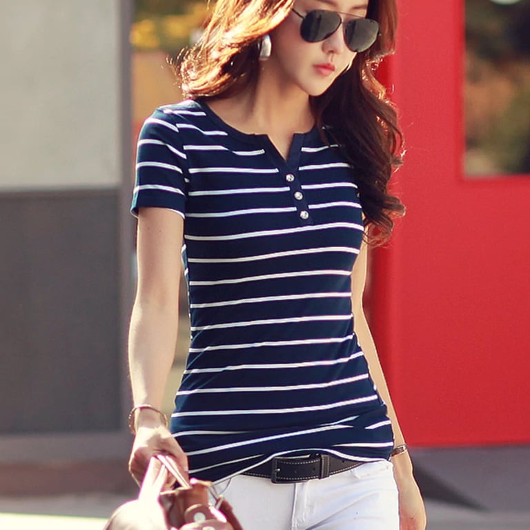 Elegant dames T-shirt met korte mouwen. Het heeft een ronde hals met knopen. Het is versierd met fijne strepen.