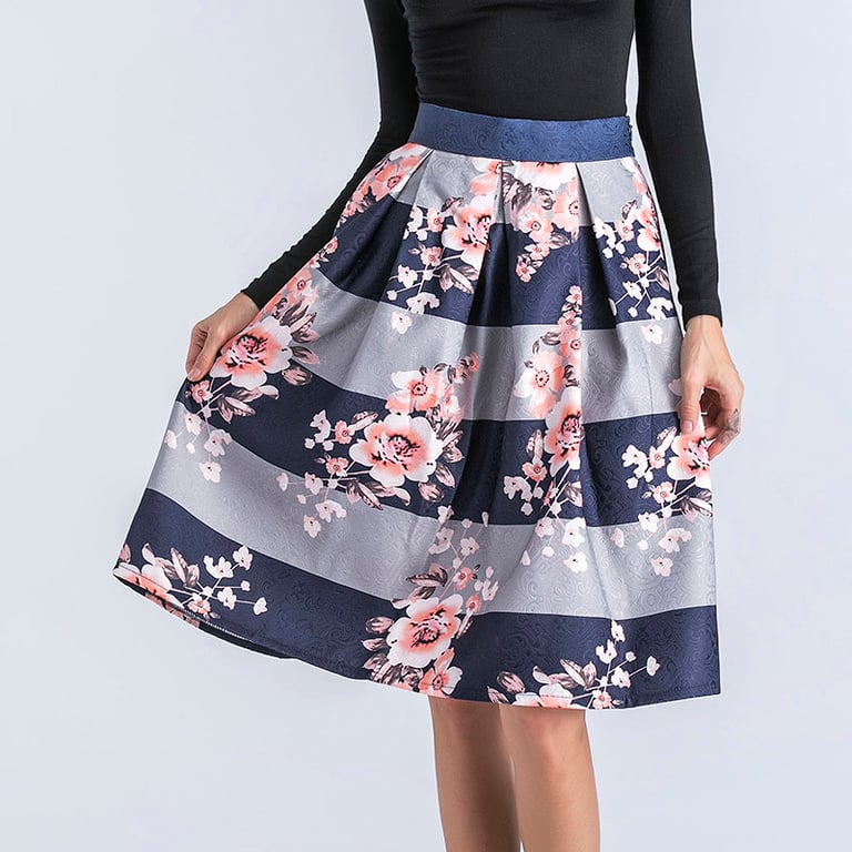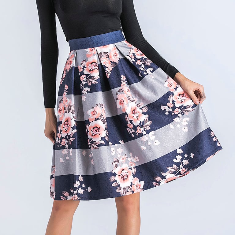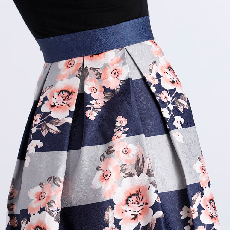 Wees schattig met deze rok met strepen en bloemen.