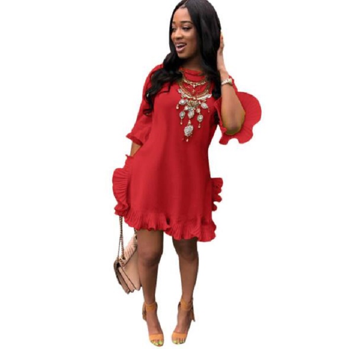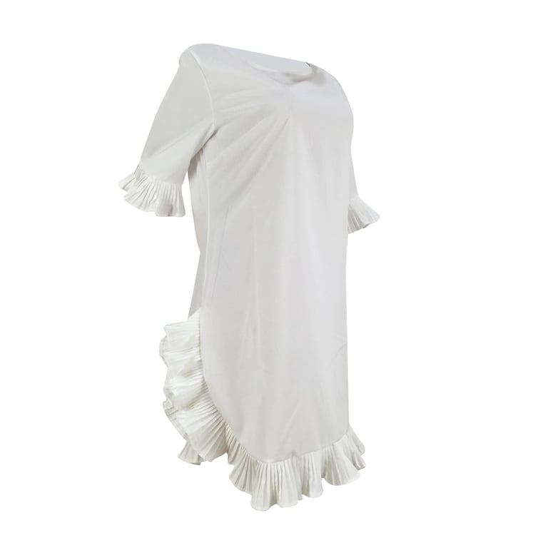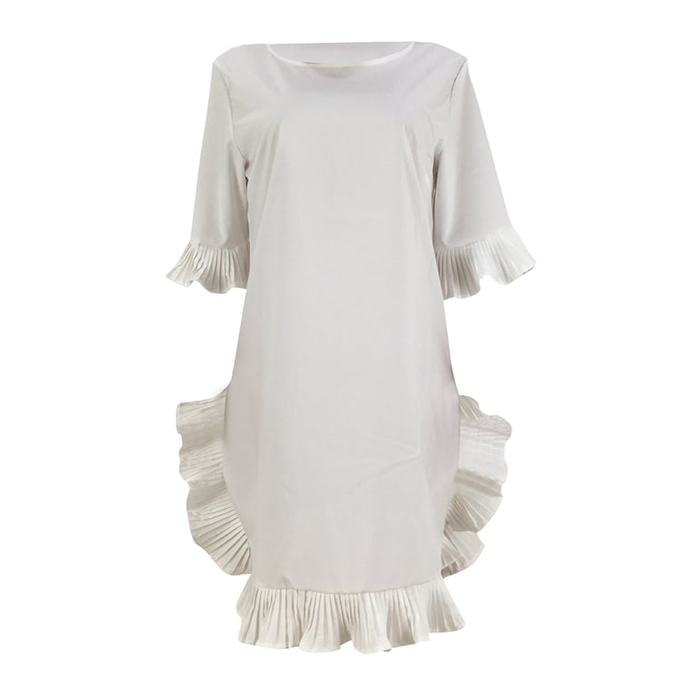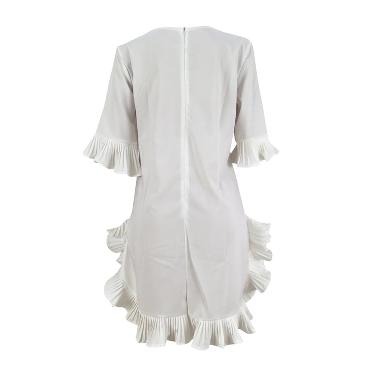 Volantafwerking van de rok en mouwen. Moderne halslijn.