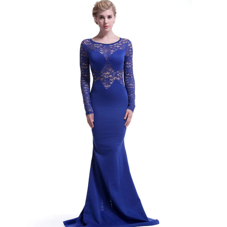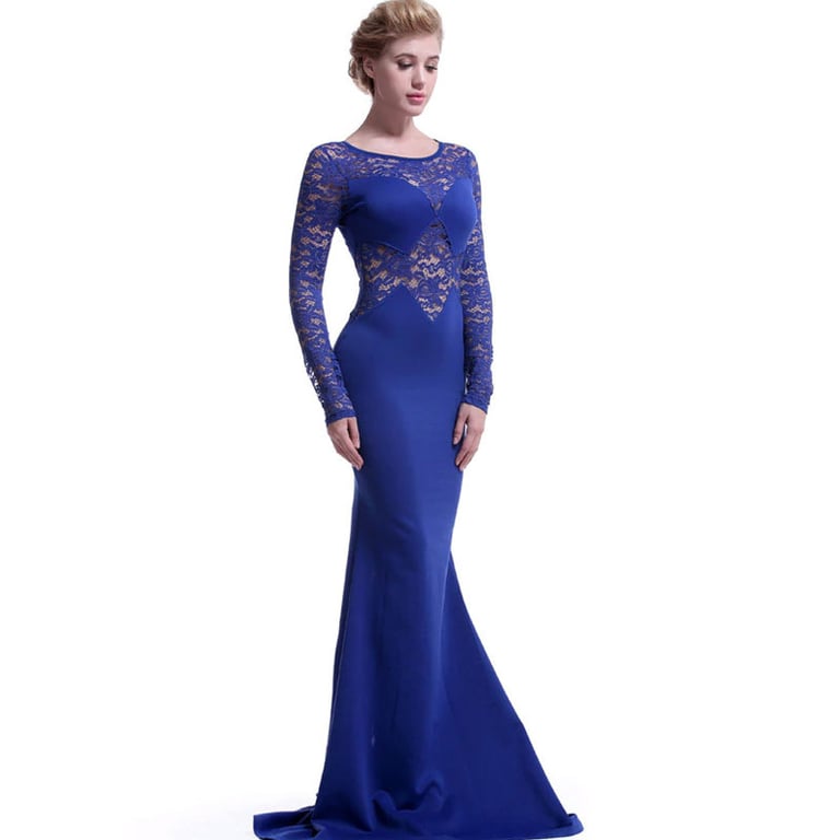 Dames lange avondjurk met lange mouwen. De jurk sluit mooi aan op het lichaam en heeft een rok die tot de grond reikt. De decolleté en mouwen zijn versierd met kant. Beschikbaar in drie kleuren – zwart, rood en blauw.