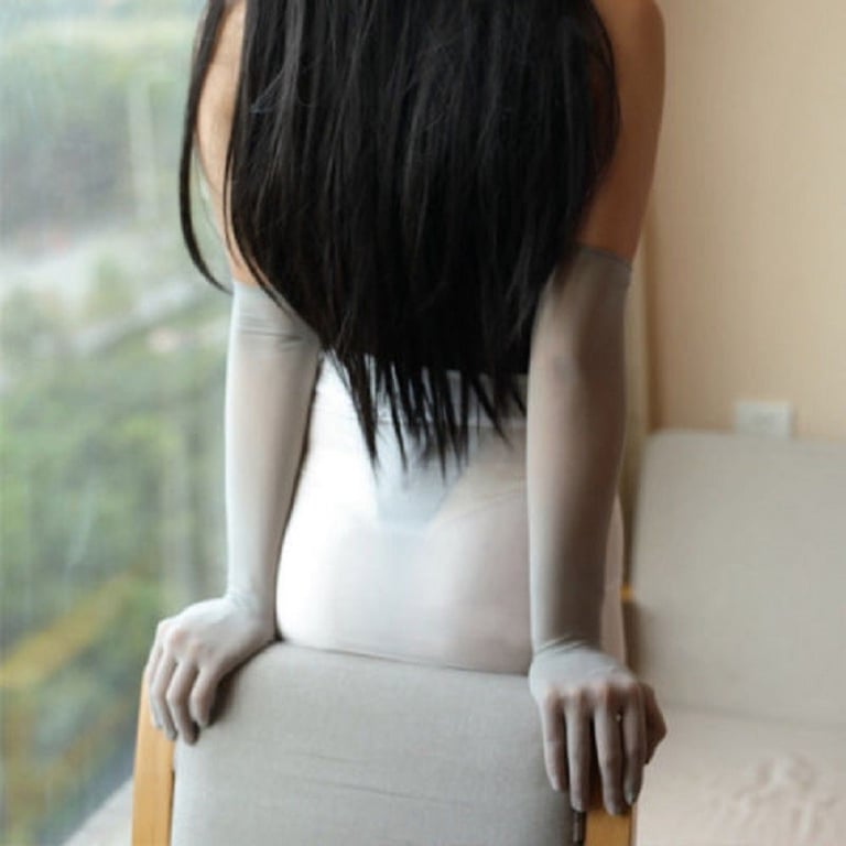 Lange naadloze handschoenen van licht doorzichtig stretchmateriaal.