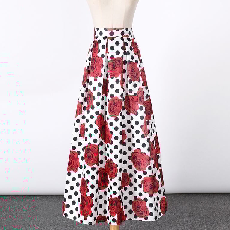 Met deze lange stippenrok met rozenprint betovert u uw omgeving.