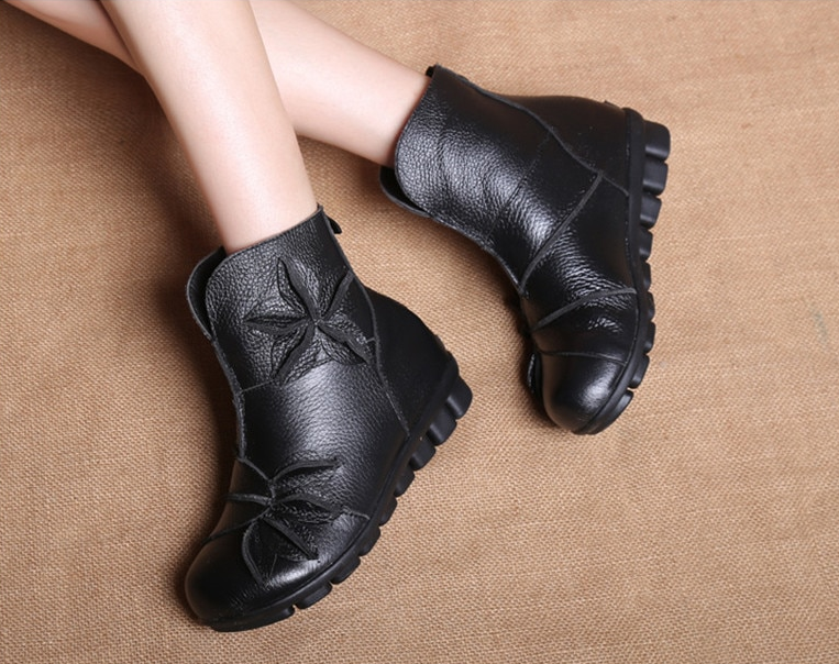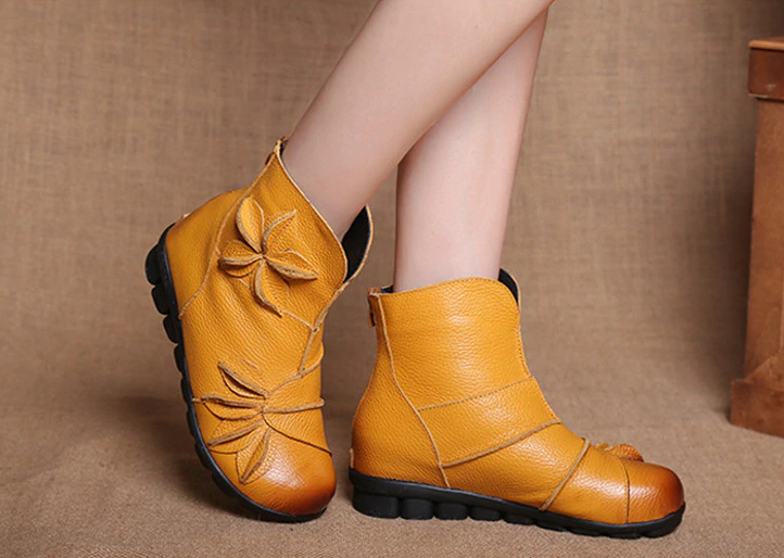 Je zult deze enkellaarsjes met bloemen geweldig vinden. De schoenen zijn van leer en hebben een ritssluiting.