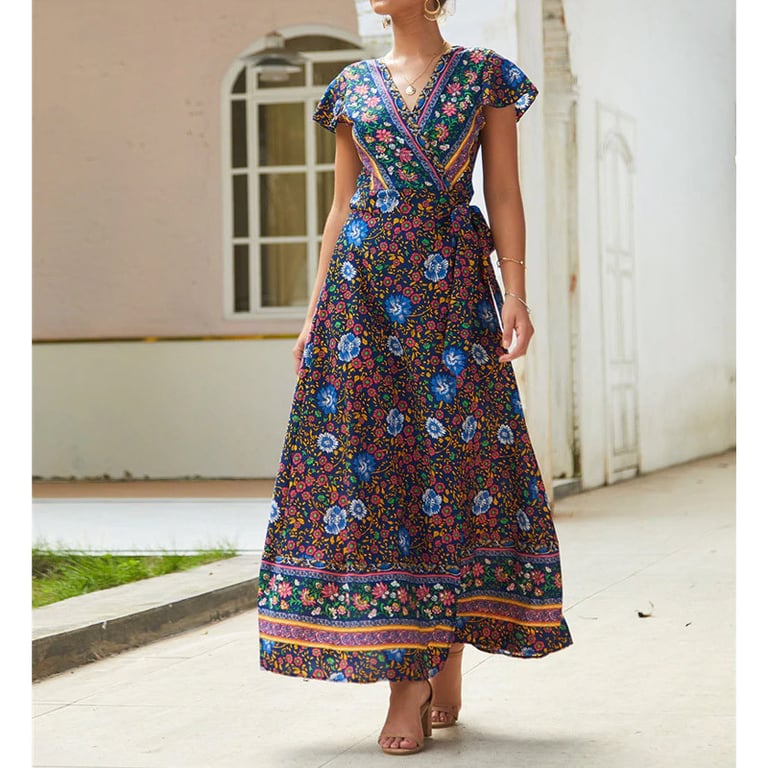 Dames lange jurk met korte mouwen. Vrije wikkelstijl met een strikceintuur in de taille. Bedrukking met kleurrijk patroon. Meer kleurvarianten beschikbaar.