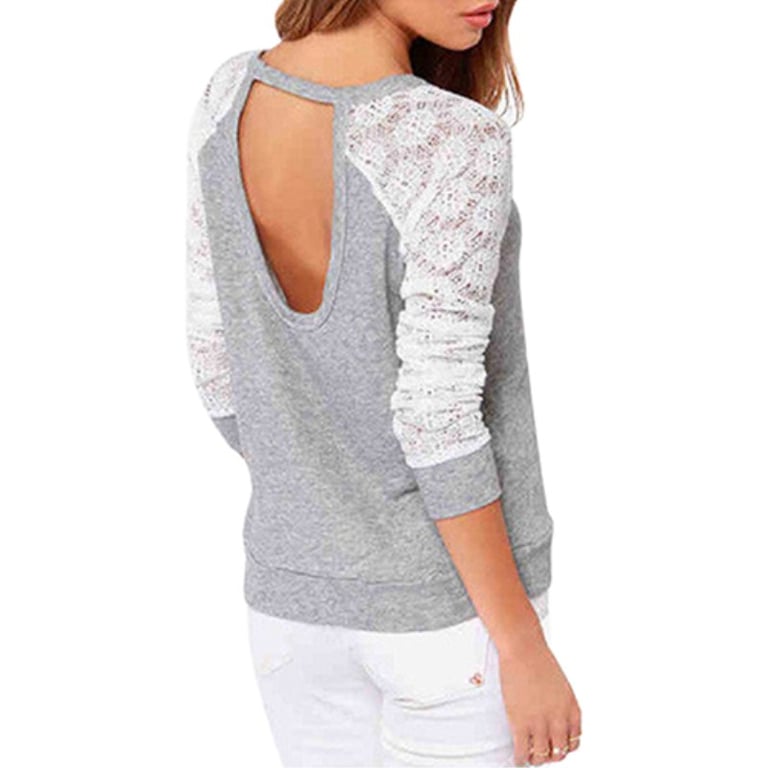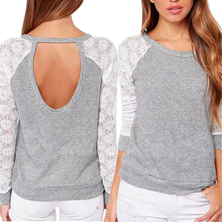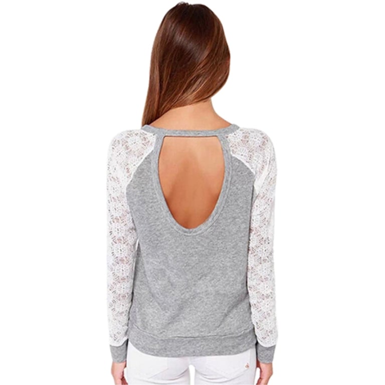 Modieuze grijze hoodie met 3/4 mouwen. Heeft kantmouwen en een aantrekkelijk uitgesneden rug. Elegante hoodie voor het voorjaar.