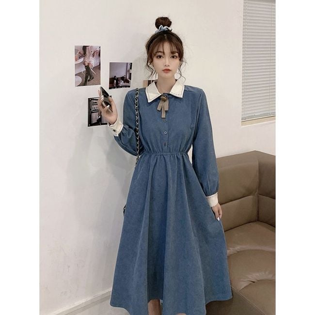 Dames ouderwetse jurk met lange mouwen - donkerblauw