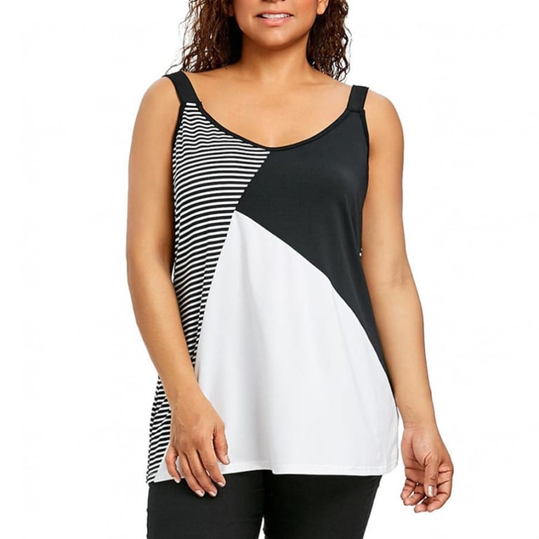 Dames plus size top met zwart-wit asymmetrisch patroon.