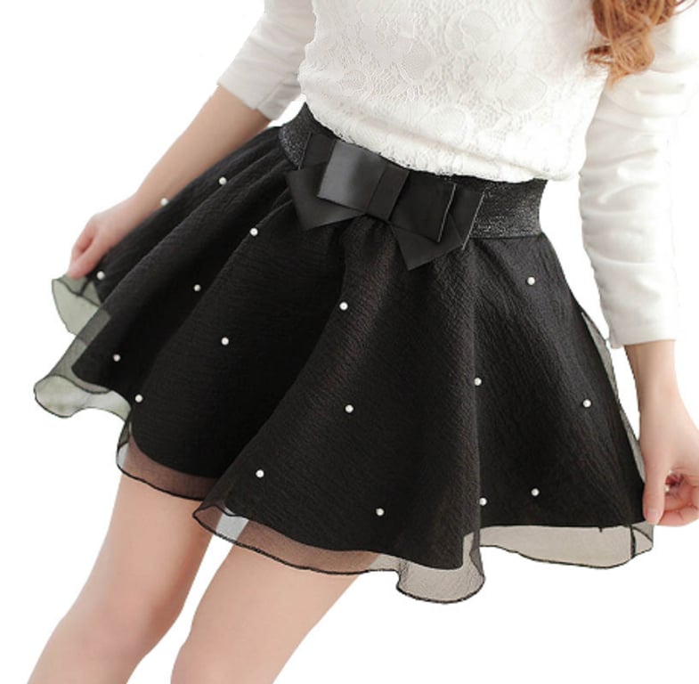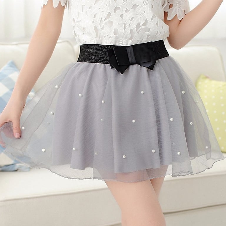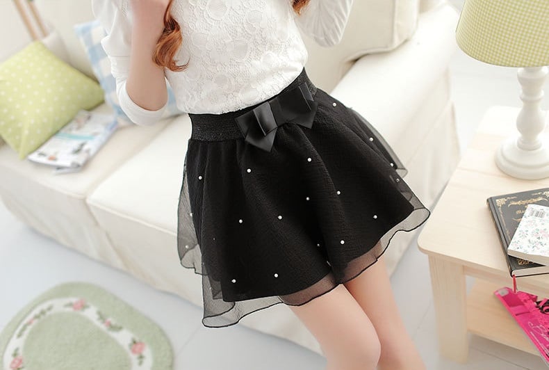 Mooie mini rok met een rand, parels en een strik rond de taille maakt van jou de koningin van de zomer.