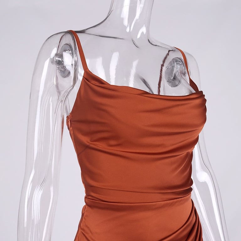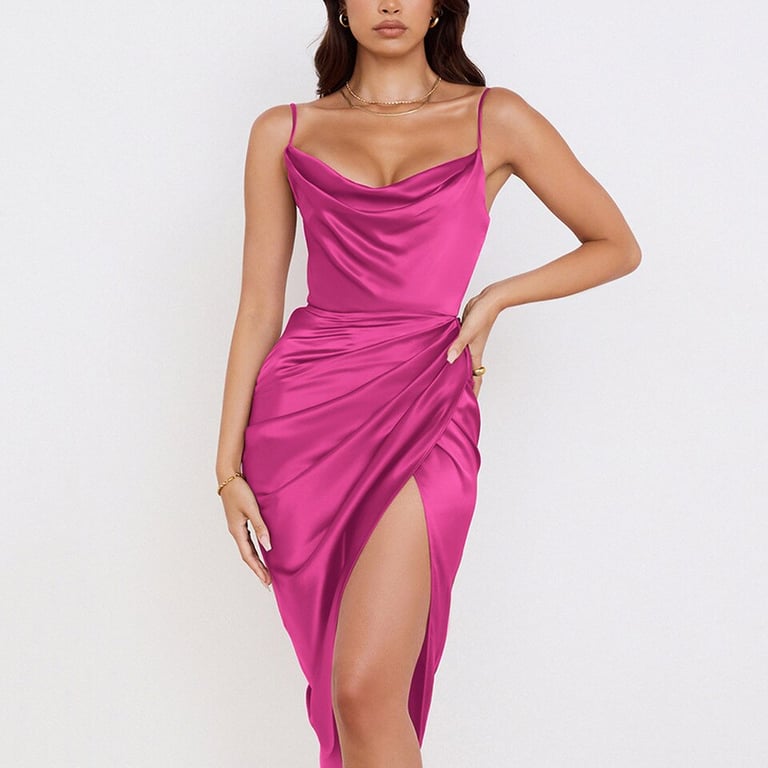 Dames sexy satijnen midi-jurk met split en spaghettibandjes