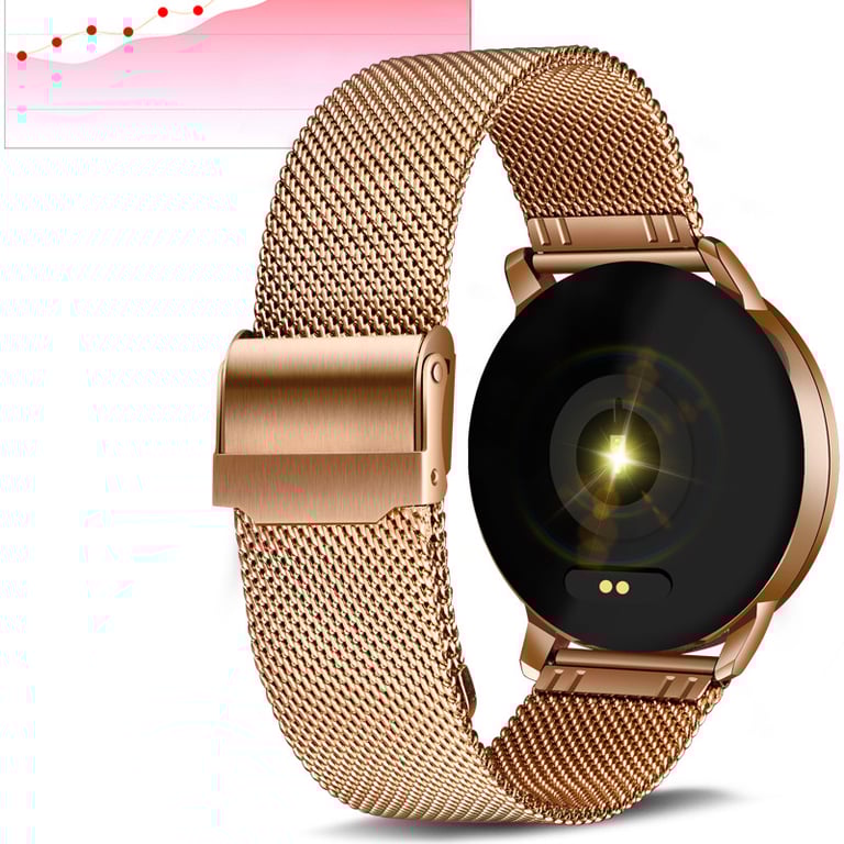 Dames elegante horloge met slimme functies en een stijlvolle uitstraling. Het apparaat toont het aantal stappen, de hartslag en natuurlijk ook de tijd.