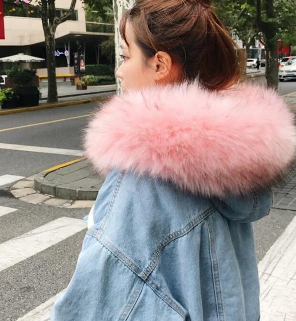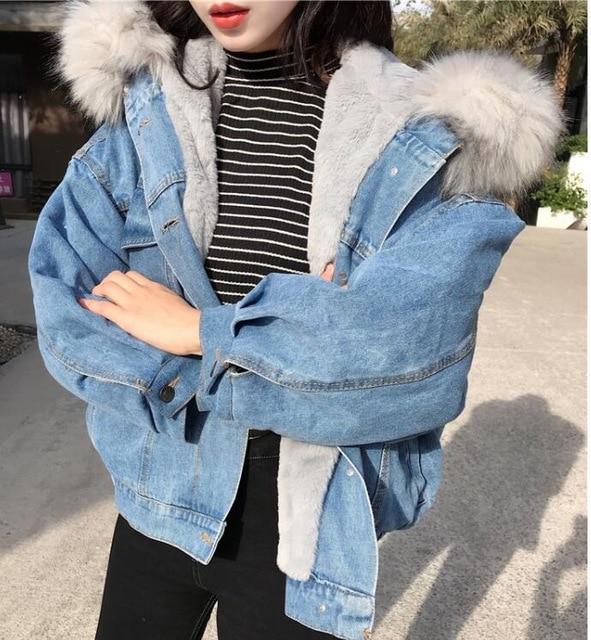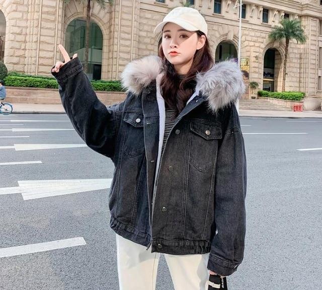 Dames spijkerjack met voering en modieuze capuchon van kunstbont voor koude herfst- en lentedagen.