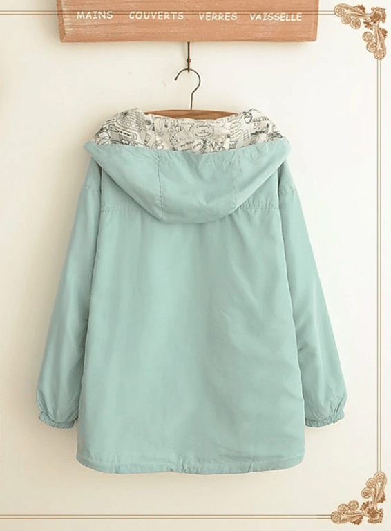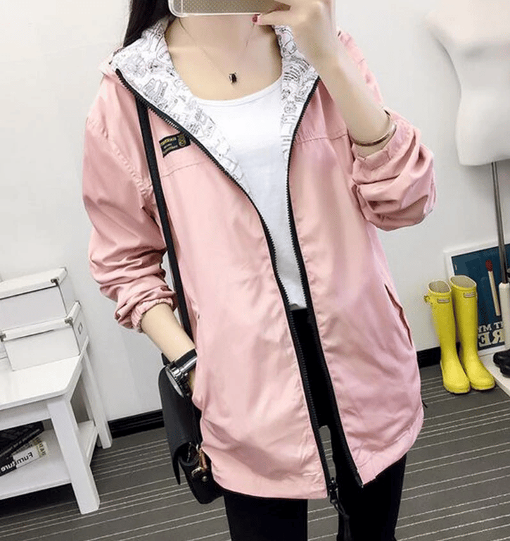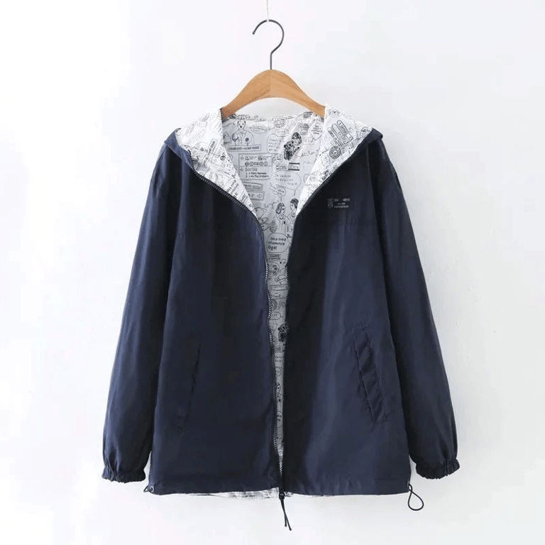Dames reversible jas, die aan de ene kant kleurrijk is en aan de andere kant een stijlvolle print heeft.