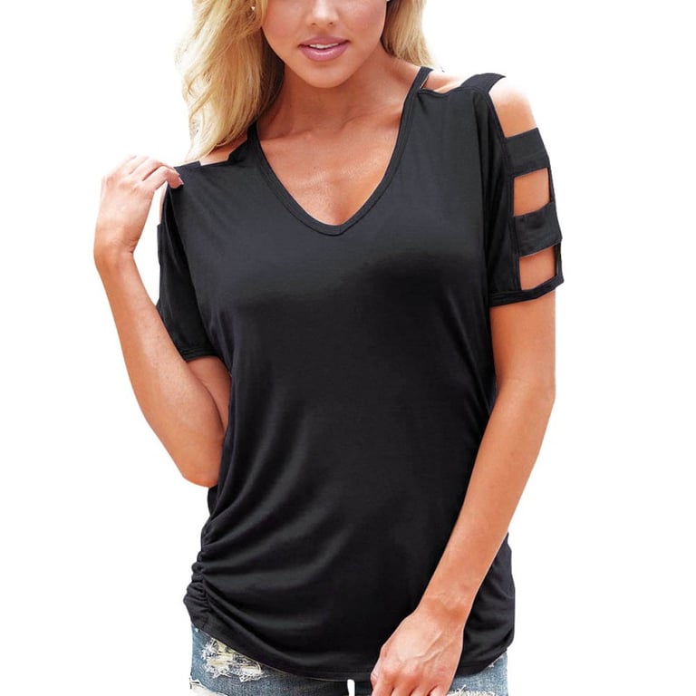 Dames T-shirt met korte mouwen. De mouwen hebben modieuze uitsparingen. Het T-shirt heeft een elegante snit.