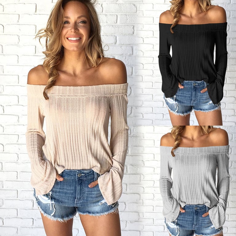 Dames T-shirt met lange mouwen, geribbelde stof. Heeft modieuze blootgestelde schouders. Ideaal voor de lente en de zomer.