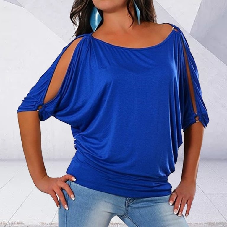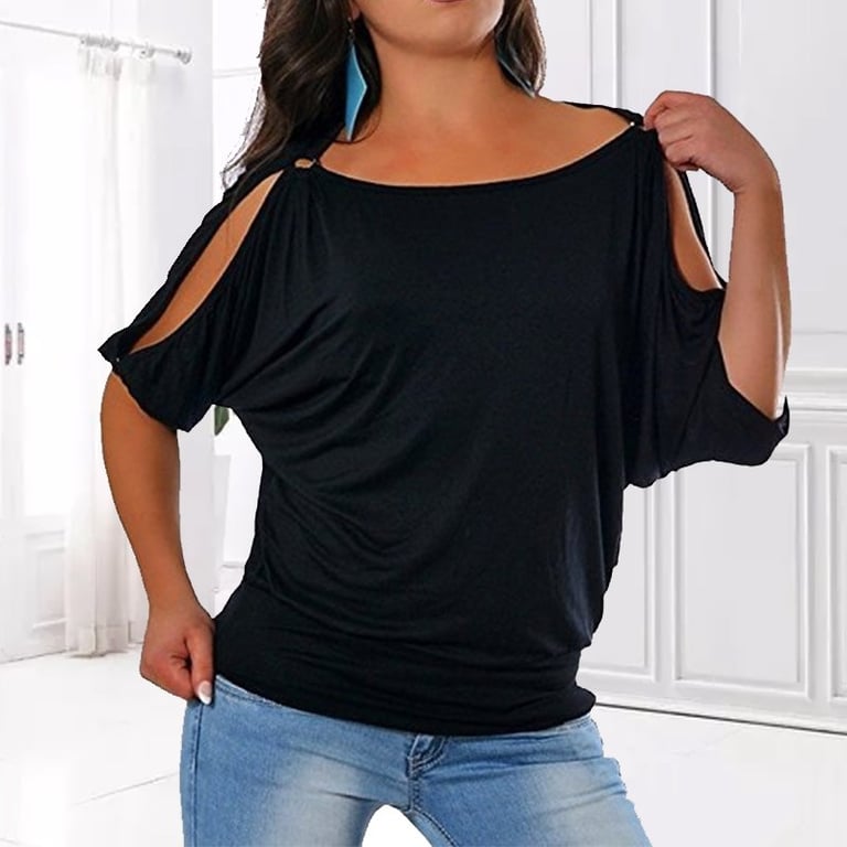 Elegant dames T-shirt met korte mouwen, waarin een brede uitsnijding is. Deze is verbonden met ringen aan beide uiteinden. Het T-shirt heeft een bootuitgesneden hals.
