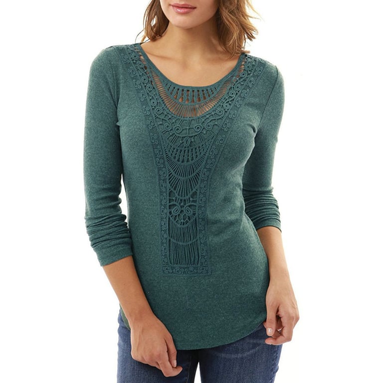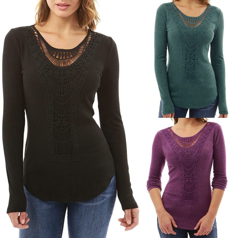 Mooie elegante T-shirt met kant applicatie. Het heeft lange mouwen en een ronde hals.