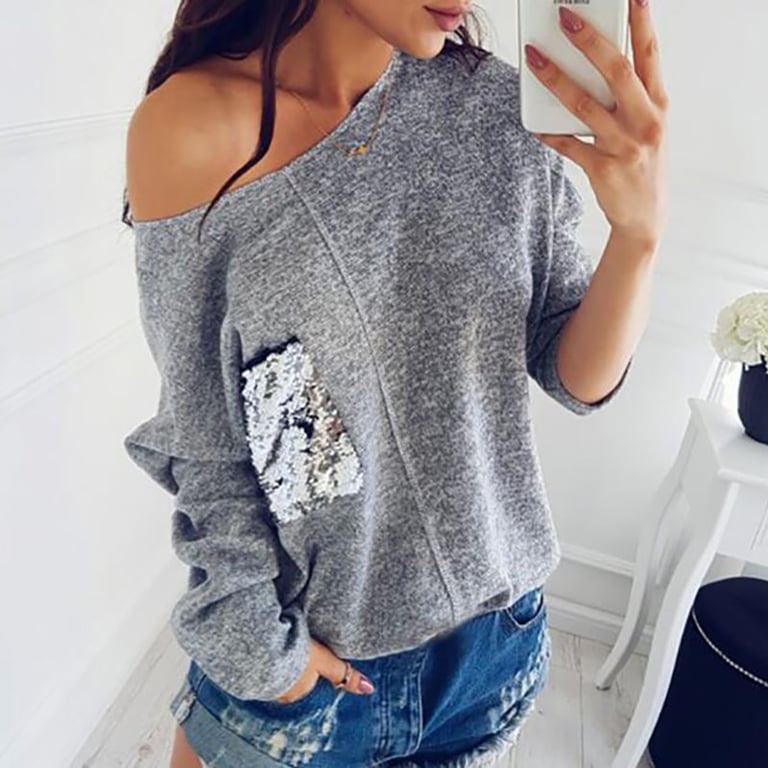 Stijlvol dames T-shirt met een bootvormige halslijn en één schouder die naar beneden valt. Het heeft een glinsterende zak. Ideaal voor vrije momenten.
