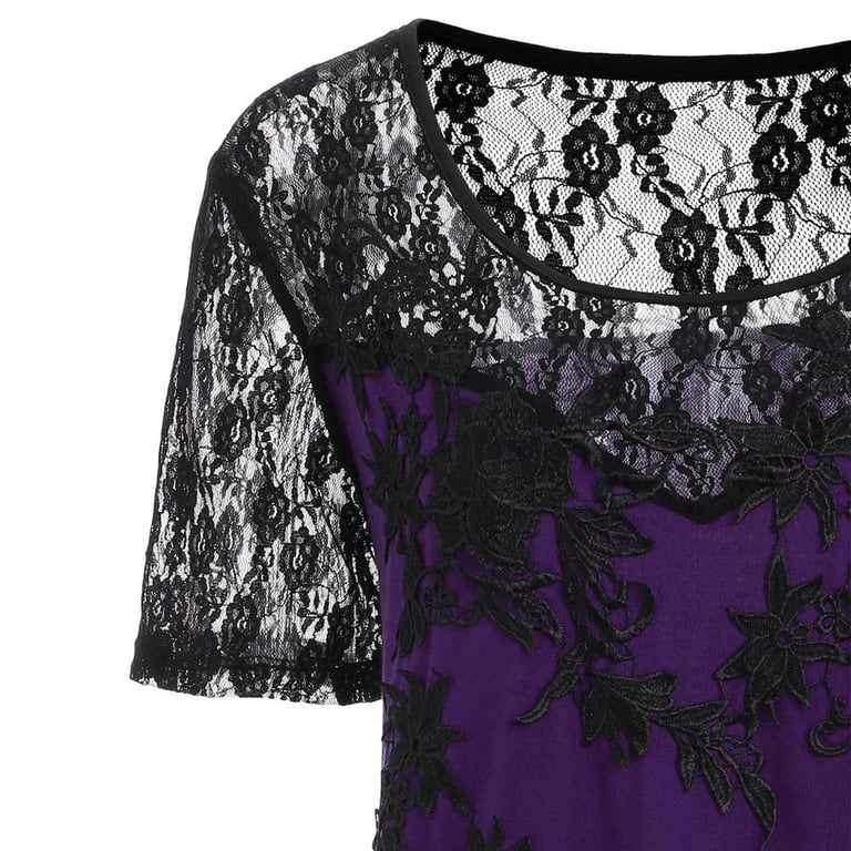 Elegante dames T-shirt, versierd met prachtige bloemenkant. Het heeft een ronde hals en een asymmetrische lengte.