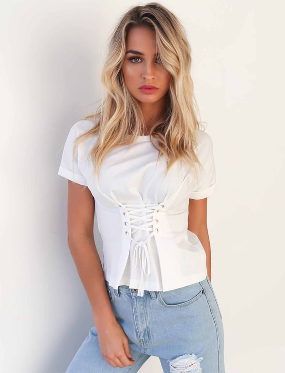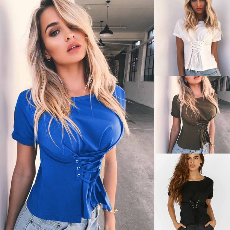 Dames stijlvol T-shirt met vetersluiting onder de borsten. Korte mouwen en een diepe decolleté.