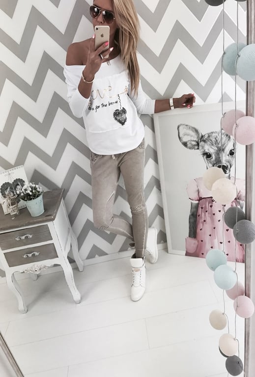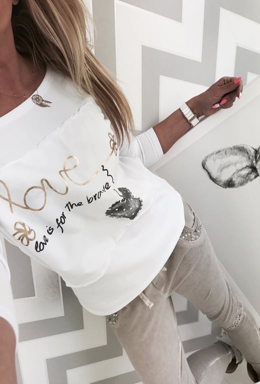Mooie witte T-shirt met teksten. Heeft een grote bootvormige halslijn en modieuze afhangende schouders. Elegante snit. Geschikt voor dagelijks gebruik.