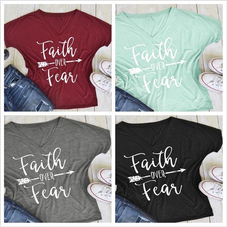 Modern t-shirt voor dames met de tekst FAITH OVER FEAR zal elke jonge dame aanspreken.
