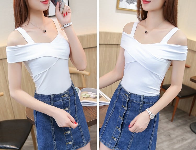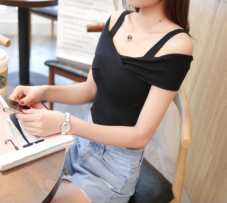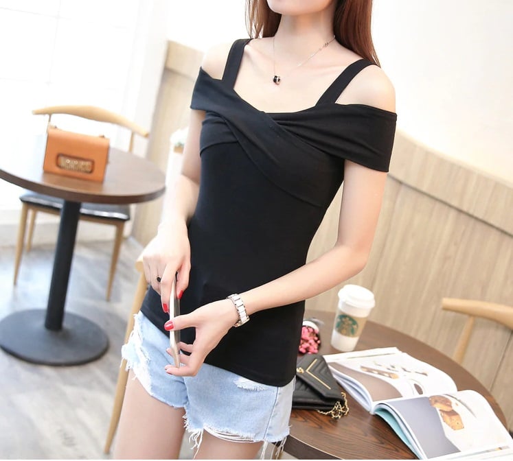 Mooie dames T-shirt met korte mouwen. Het heeft een stijlvolle kruisdecolleté en blootgestelde schouders. Geschikt voor op het werk of voor een koffie met een vriendin.
