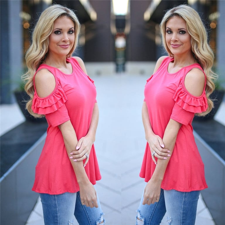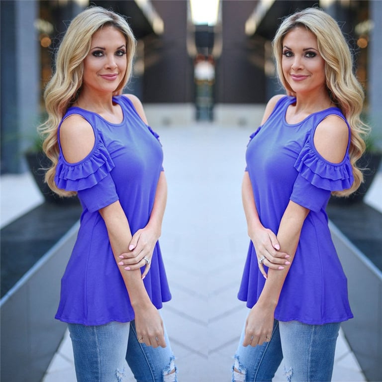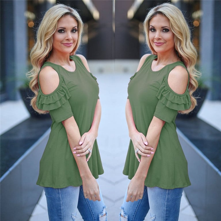 Mooie elegante T-shirt met korte mouwen en ruffles op de mouwen. Het heeft blote schouders en een lossere pasvorm. Het is verkrijgbaar in vier prachtige kleuren.