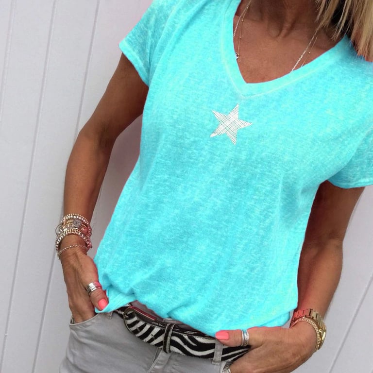Dames T-shirt met korte mouwen. Het is in prachtige neonkleuren en versierd met een ster. Ideaal voor de zomer.