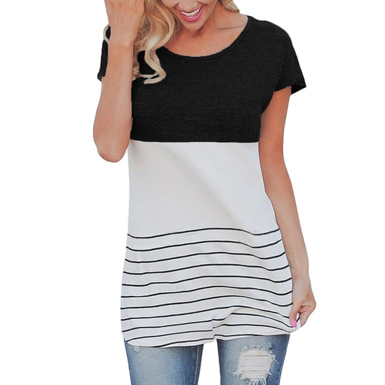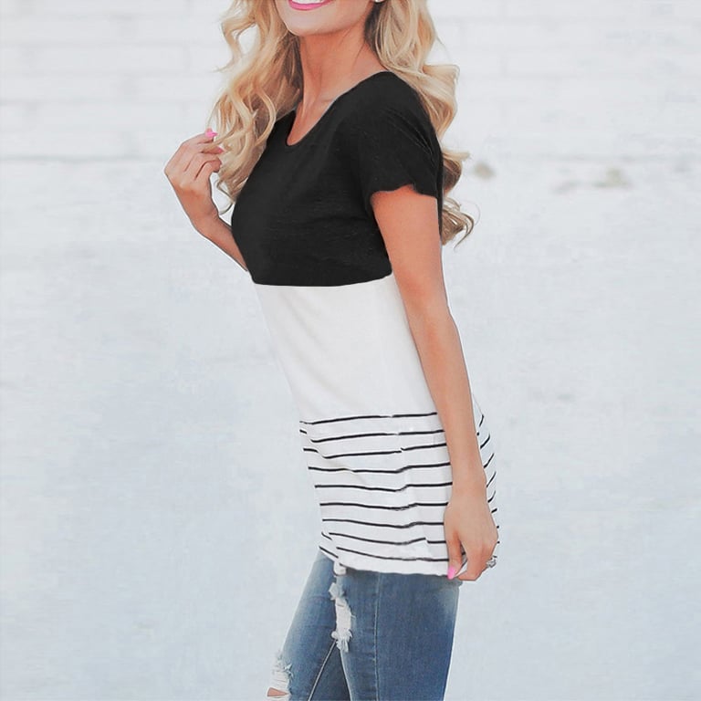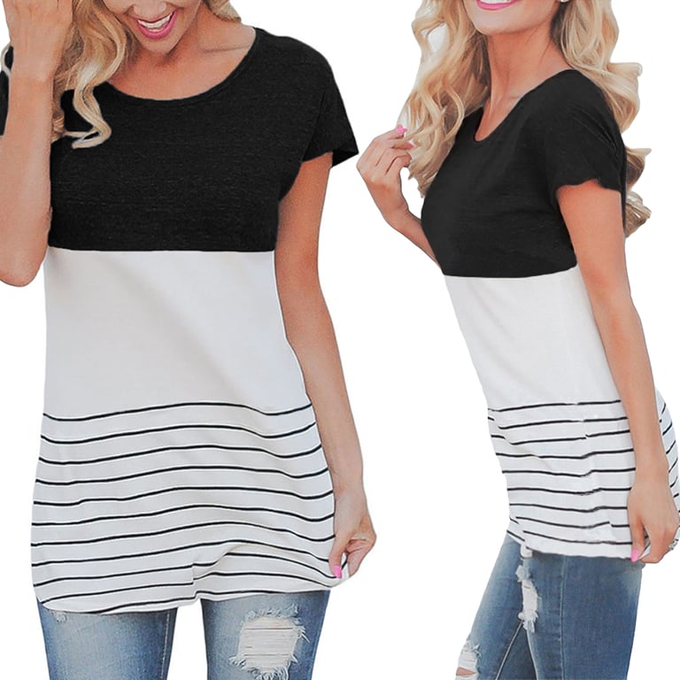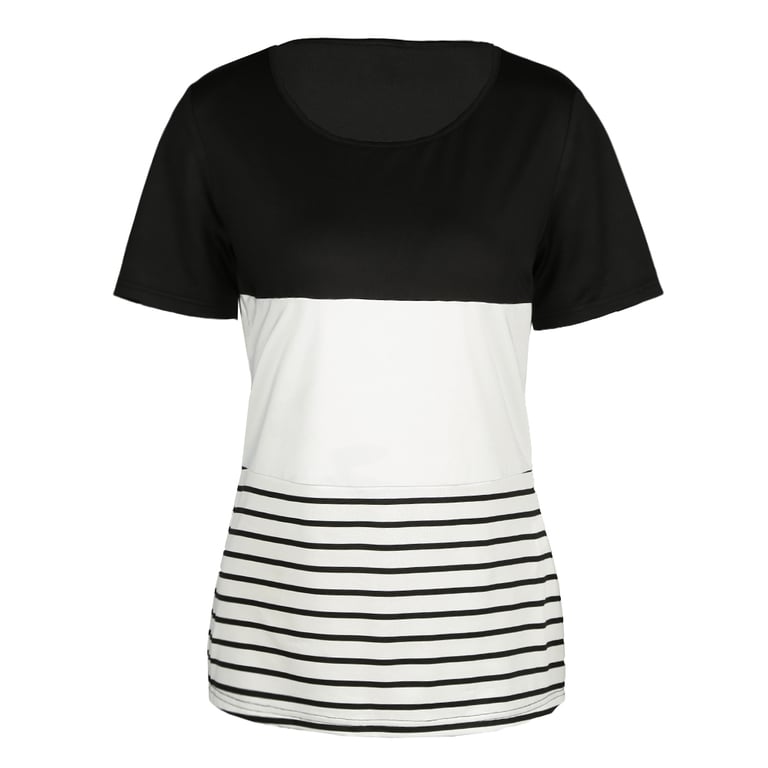 Mooie gestreepte T-shirt voor vrije tijd. Het heeft korte mouwen en een ronde hals. Elegante zwart-witte combinatie.