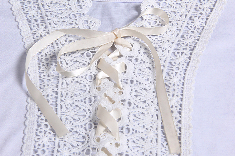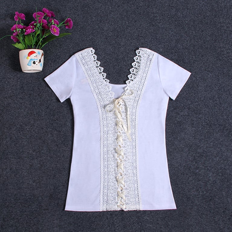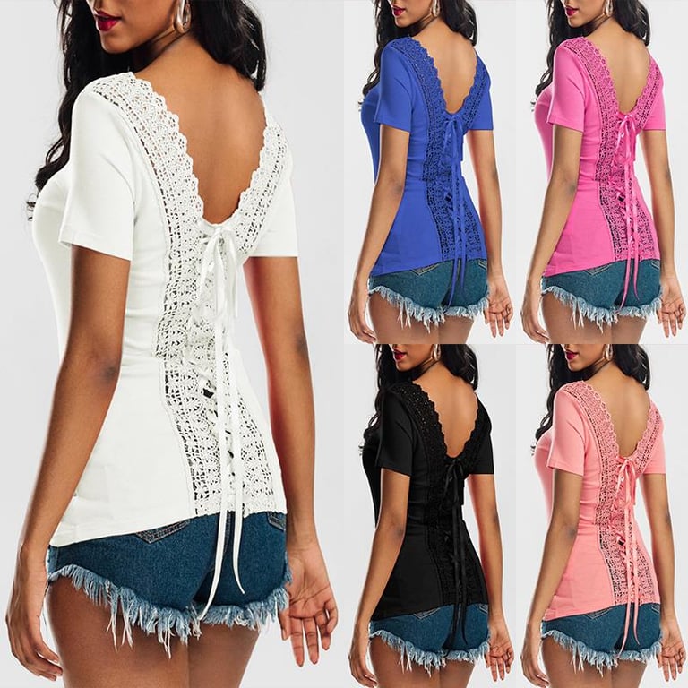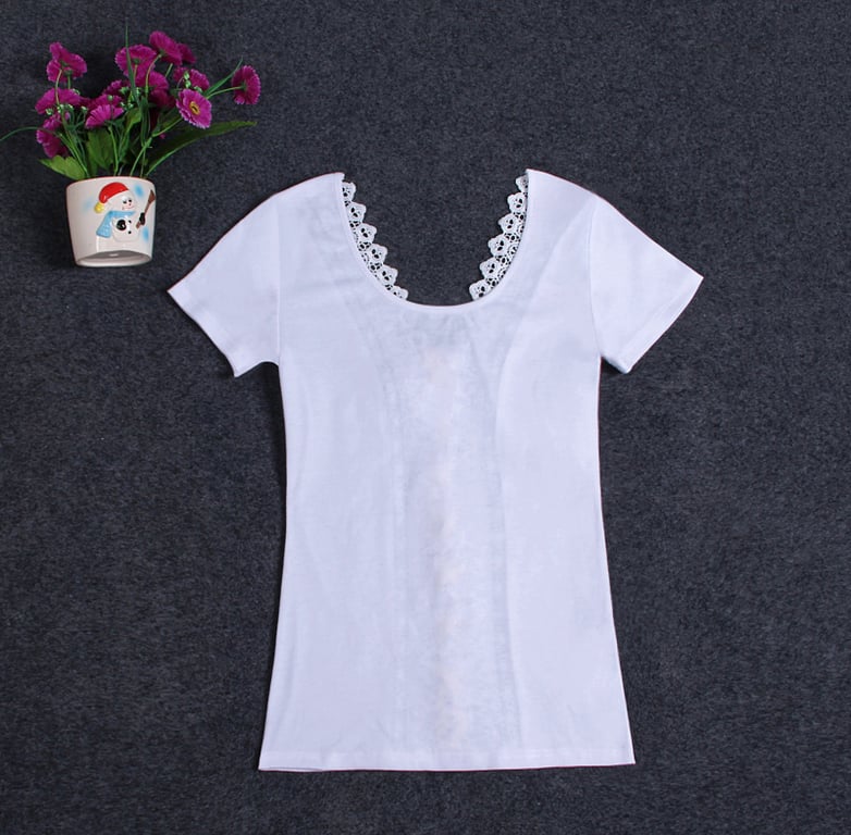 Dames T-shirt met korte mouwen. Het heeft een kantdetail op de rug en is te strikken, met een ronde hals. Ideaal voor de zomer.