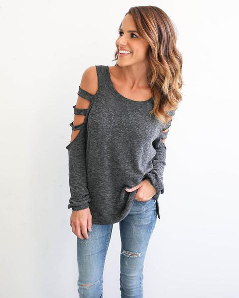 Dames losse T-shirt met ronde hals. Het heeft stijlvolle uitgesneden lange mouwen. Zeer flatterende snit.