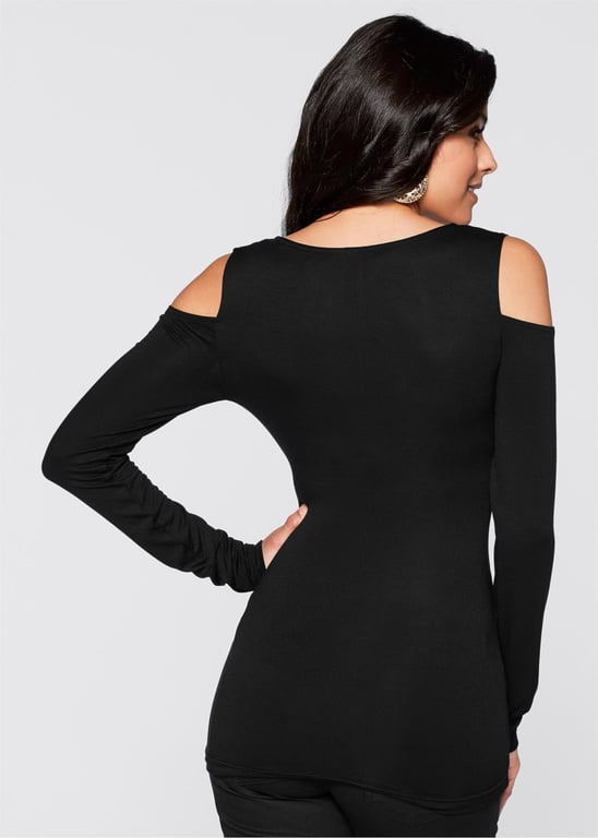 Zwart aantrekkelijk shirt met lange mouwen en uitgesneden schouders. Het heeft een diepe V-hals, een wikkel-effect en is lichtjes geraffineerd.