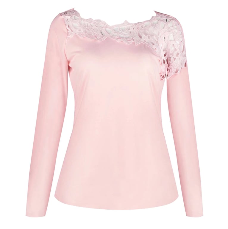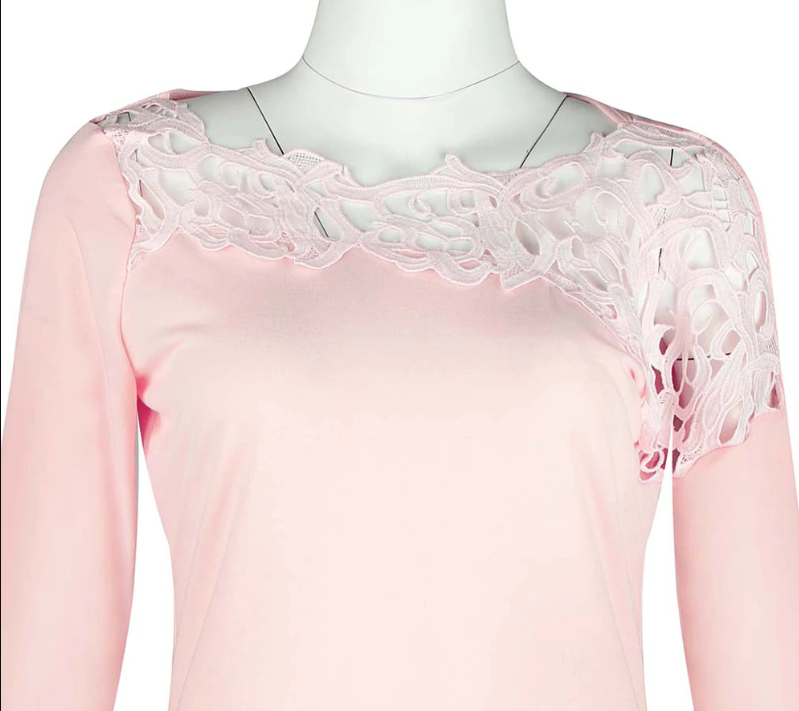 Elegante dames T-shirt met een decoratieve kanten halslijn. Zachte roze kleur, aangenaam materiaal.