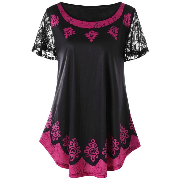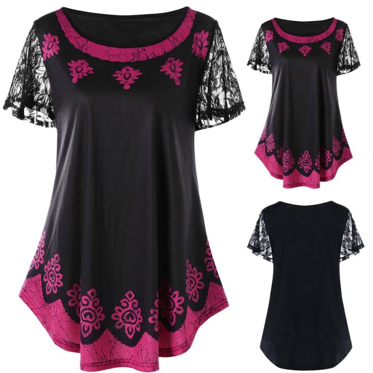 Dames top met korte mouwen. Kleur – zwart en paars. Versierd met kant.