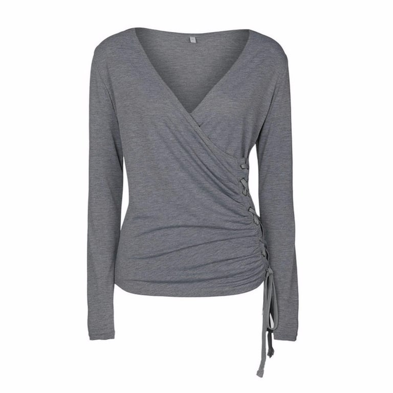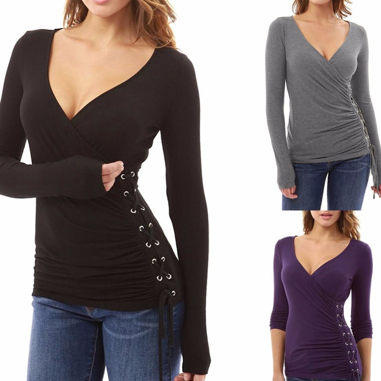 Dames top met lange mouwen en modieuze vetersluiting aan de zijkant. Lange mouwen, V-hals.