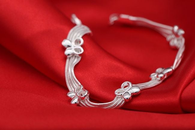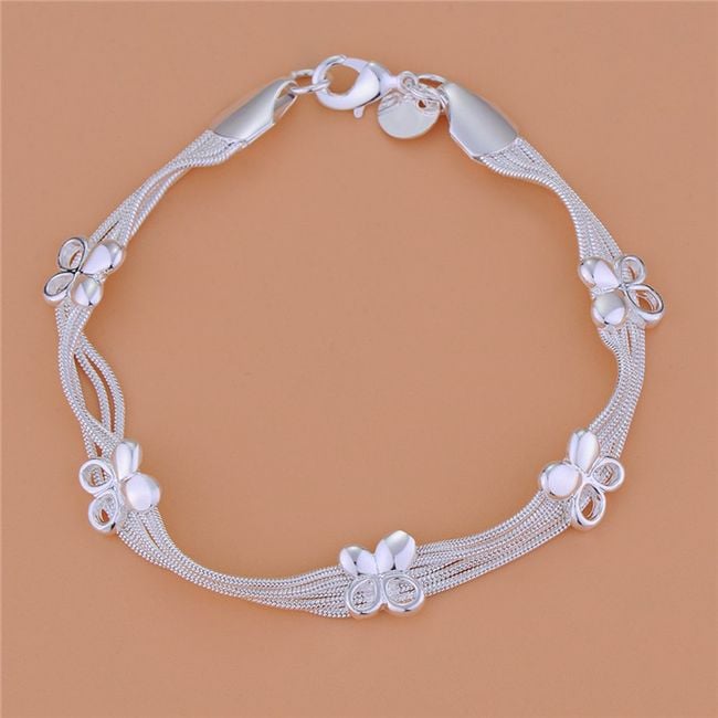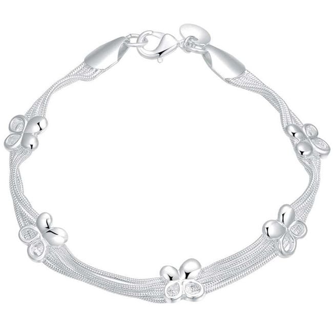 Damesarmband, versierd met gelukssymbolen – klavertjes vier! Het armbandje is gemaakt van fijnere draadjes en heeft een klassieke haaksluiting.