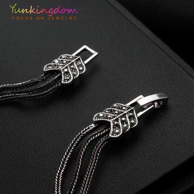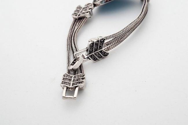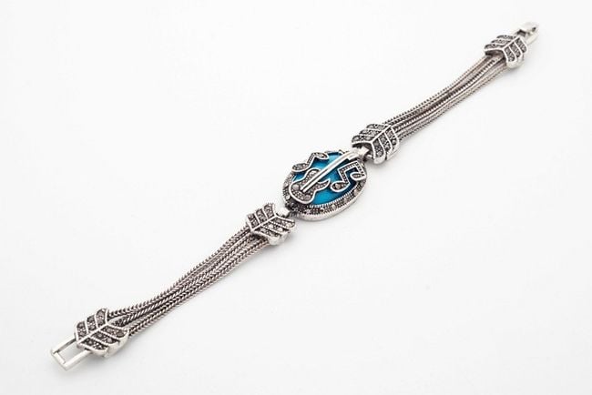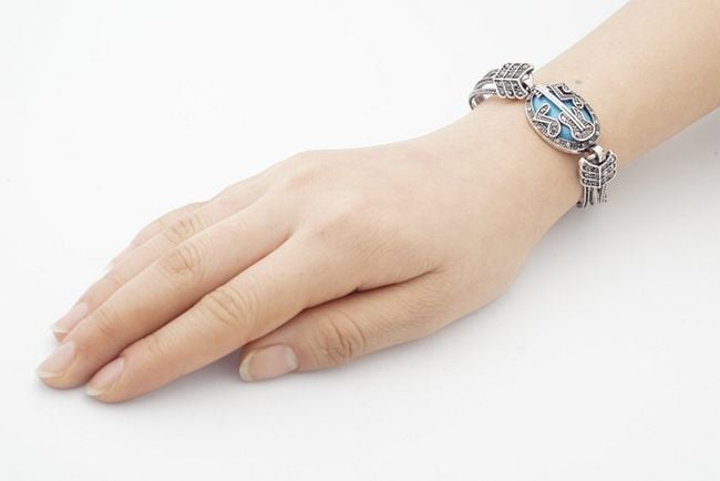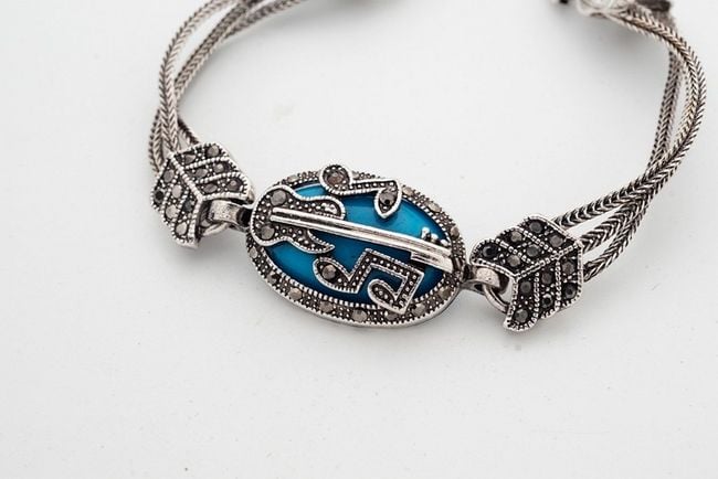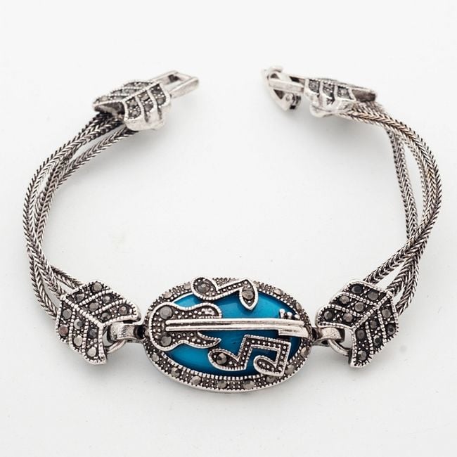 De armband is versierd met een blauwe amulet met muzikale elementen.